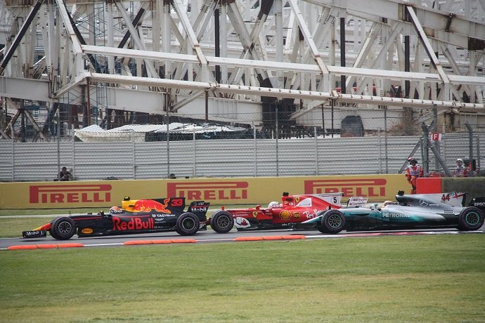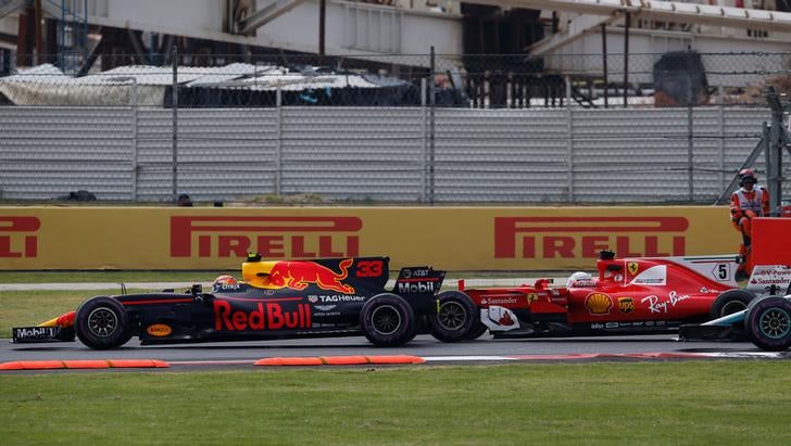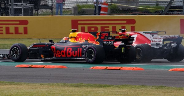 Na frente, Verstappen forçou para passar Vettel e ao perder também para Hamilton na saída da 3ª curva, o alemão tocou com a asa dianteira do seu Ferrari no pneu traseiro do Mercedes de Lewis.