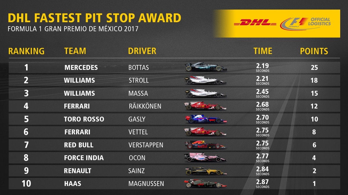 Os mecânicos da Mercedes, a exemplo do que aconteceu no GP dos EUA em Austin na semana anterior, fizeram o melhor crono no pitstop. A Mercedes fecha na Williams como melhor escuderia na temporada a ganhar um GP na operação de troca de pneus. Agora Williams 7, Mercedes 6, Red Bull 4, Ferrari 1.