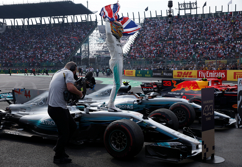 Hamilton colocou as mãos no capacete ao cruzar a linha de meta, Vettel esperou por ele na volta de consagração e aplaudiu enquanto a multidão no Hermanos Rodriguez exaltava uim momento histórico. Tudo numa corrida em que na largada, o piloto da Mercedes sofreu um furo provocado pela asa dianteira do carro de Vettel, o seu rival para o título. Ambos os pilotos tiveram de ir à boxe e a partir daí fazerem uma recuperação. Hamilton não precisava de um bom resultado na corrida para carimbar o título, mas Vettel teria de recuperar até ao 2º lugar pelo menos para adiar para o Brasil a decisão do campeonato.