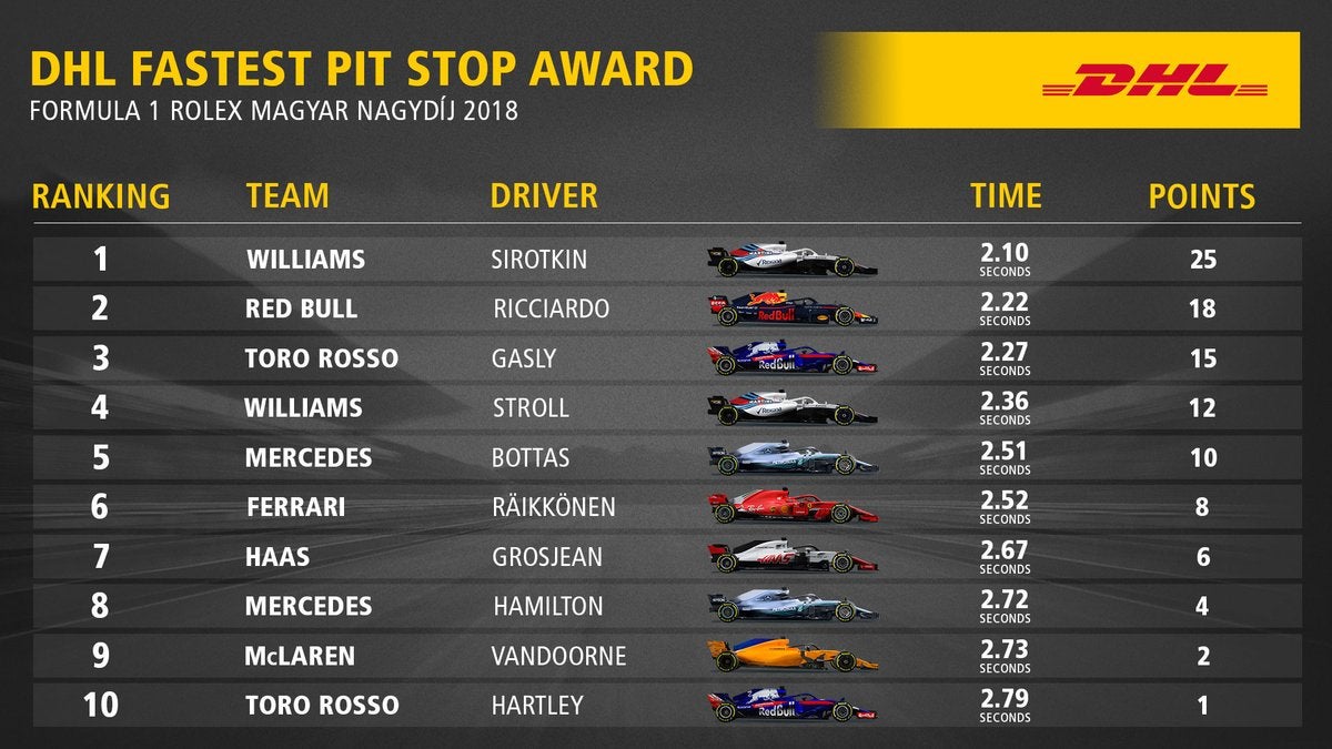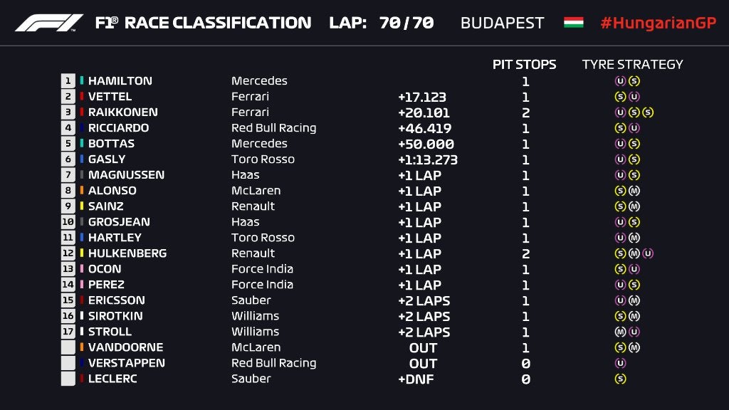 Nos mundiais, Pilotos Hamilton comanda com 213 pontos, atrás Vettel 189, Raikkonen 146, Bottas 132, Ricciardo 118, Verstappen 105, Hulkenberg 52 e Magnussen 45. Nos Construtores é a Mercedes na frente com 345 pontos, seguida da Ferrari com 335, Red Bull 223, Renault 82, Haas 66.