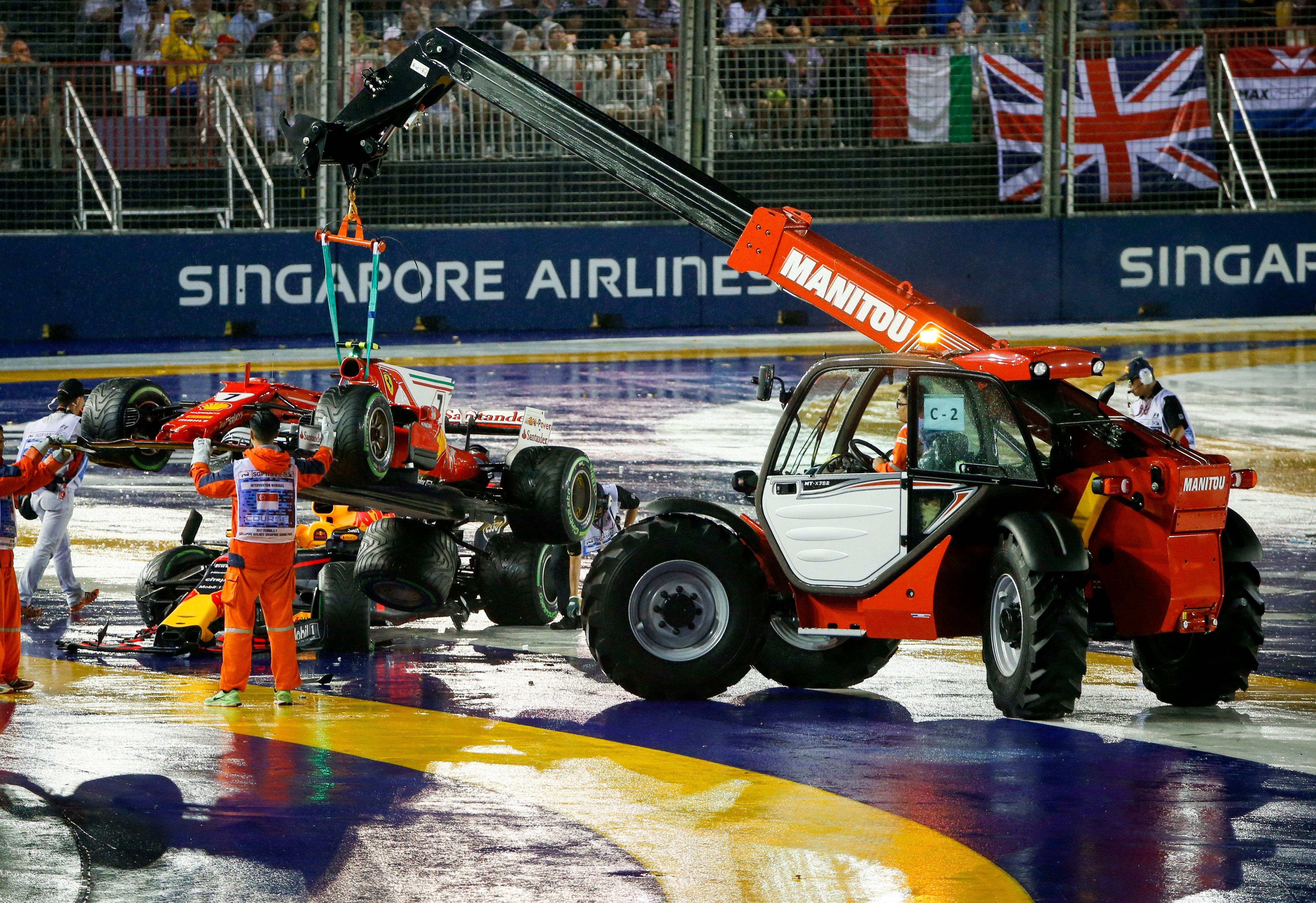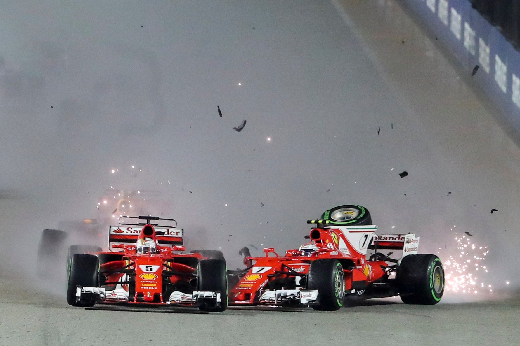 * 2 Ferraris bateram e abandonaram no arranque do GP do Mónaco de 1995. Alesi e Berger espremeram Coulthard, num incidente muito idêntico ao deste GP de Singapura. Só que na altura, corrida foi interrompida e pilotos recomeçaram GP com carro reserva. Veja. https://www.youtube.com/watch?v=dV7wjexVXzg