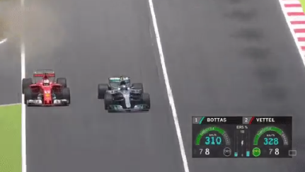 A jogada da Mercedes empregou também Valtteri Bottas, atrasando a sua paragem por forma a que ele prendê-se Vettel atrás de si durante algum tempo. E assim aconteceu. Hamilton depois do seu pit stop chegou-se a Vettel que não conseguiu passar Bottas e vendo o inglês aproximar-se quase 50% do seu déficit.