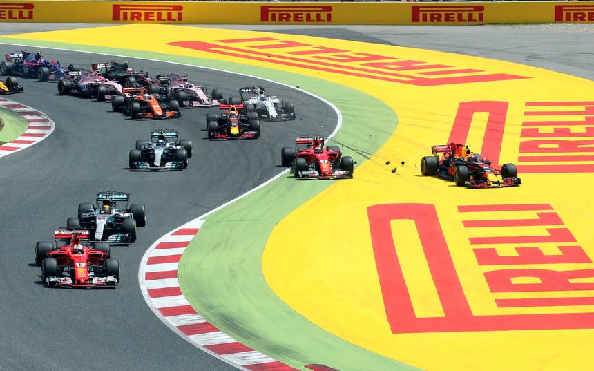 O alemão da Ferrari saindo do lado sujo da pista foi melhor no arranque e liderou durante a primeira parte do GP. Pouco depois, na 1ª curva uma carambola com 3 pilotos. Bottas e Raikkonen tocaram-se com o carro do piloto da Ferrari a ser atirado para o lado contrário onde bateu com o Red Bull de Verstappen.