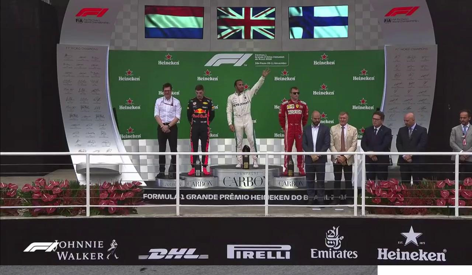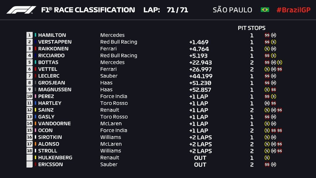 Nos construtores, a Mercedes sai campeã do Brasil com 620 pontos, a Ferrari com 553, Red Bull 392, Renault 114 e Haas 90
