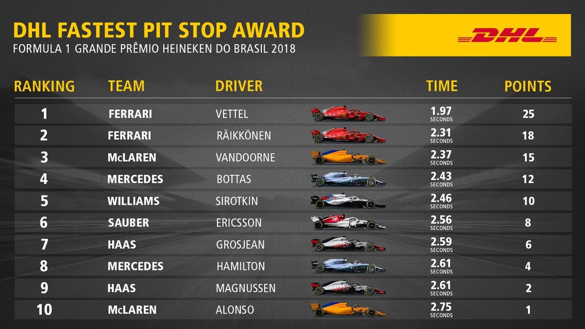 A Ferrari fez Vettel tornar-se no piloto com mais vitórias em PitStops na época. No Brasil foi a 6ª vez que a Ferrari deu a Vettel o melhor pitstop de GP. A Scuderia vence também o maior número de GPs de 2019 nas operações de boxe, independentemente do que se passe em Abu Dhabi.