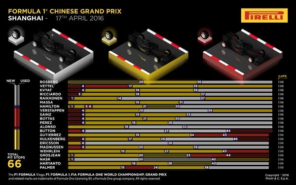 * Foram 66 os pit stops no GP da China. A Williams continua embalada na troca de pneus. Incrível, 3ª vitória em 3 GPs de 2016. Aquela que foi a 1ª paragem de Felipe Massa, na 19ª volta revelou-se como a 3ª vez em que a escuderia Williams fosse a mais rápida no procedimento de troca de pneus.