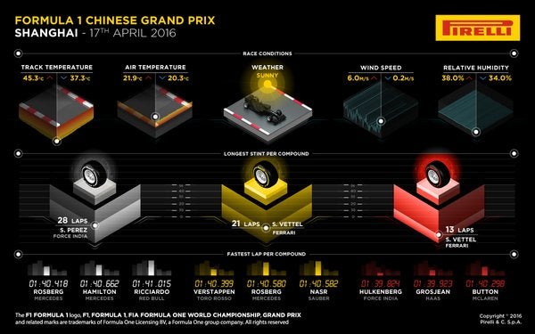 * Em Shanghai uma tarde especial. Pela 5ª vez na história todos os pilotos total). O ano passado no Japão todos os pilotos terminaram classificados, mas objetivamente Nasr abandonou na última volta. Se descontarmos esse pormenor, este é o 1º GP em que realmente todos terminam desde o GP da Europa 2011. Os outros foram GP de Itália 2005, GP dos EUA 2005 (mas só participaram aqui 6 carros - Caso Michelin, embora se possa aqui considerar que houve abandonos na corrida, por decisão de não comelar o GP após volta de formação) e GP da Holanda de 1961.