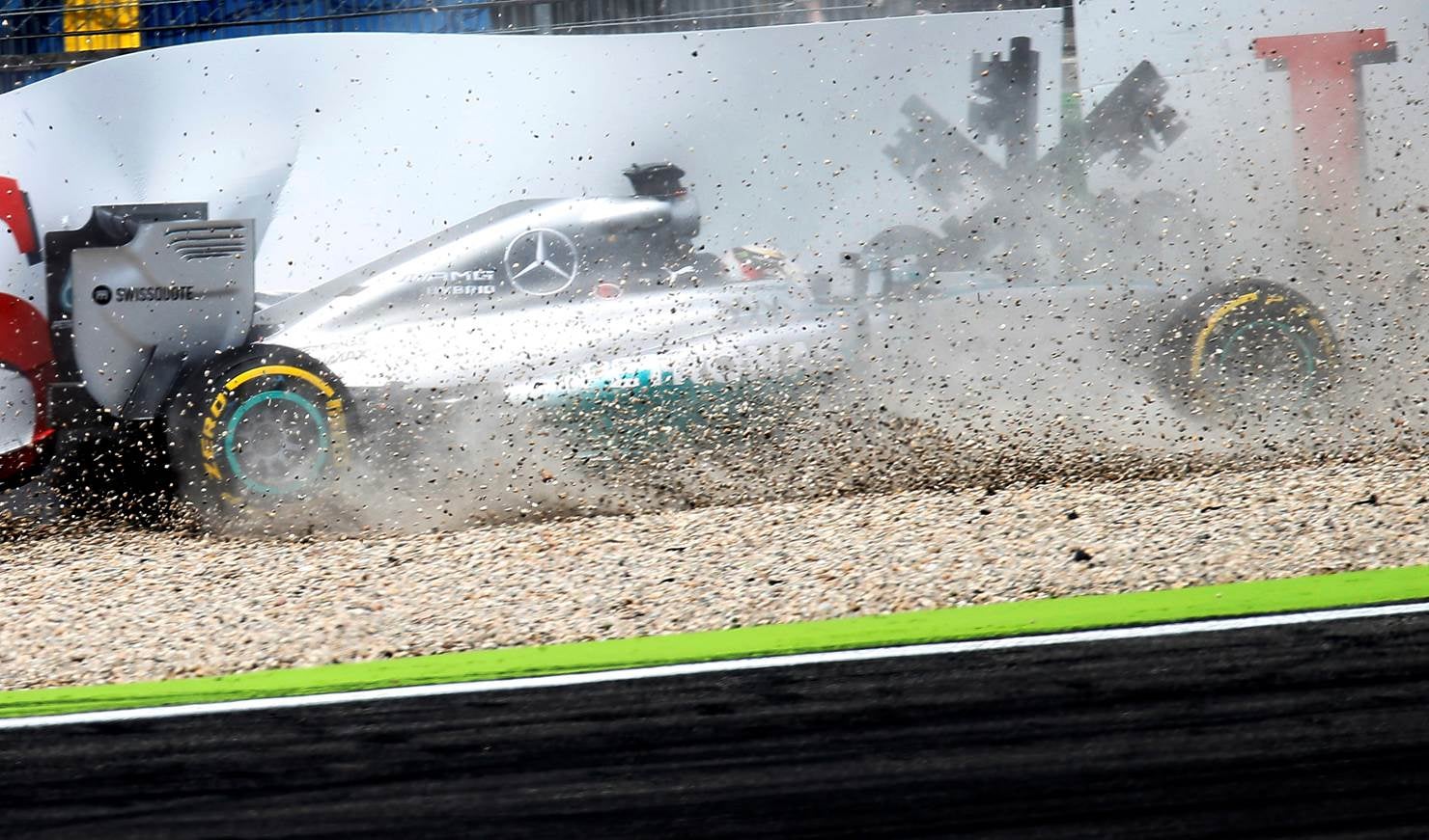rodou e saiu direto à proteção de pneus, na curva Sachskurve, em plena