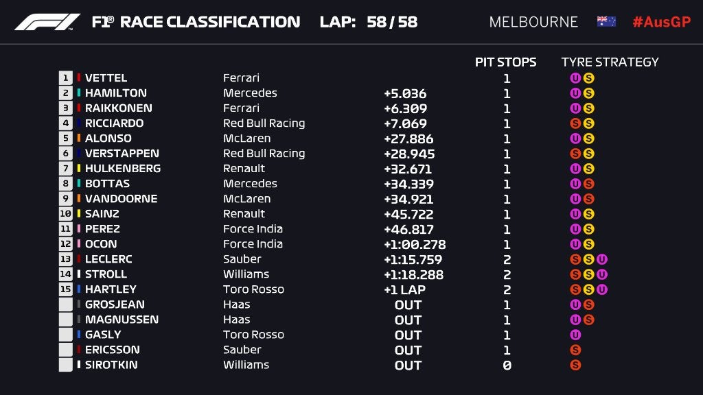 Sebastian Vettel aproveitou a oportunidade de um Safety Car virtual para roubar a vitória a Lewis Hamilton no arranque da temporada de F1, em Melbourne. O piloto da Ferrari naquela que foi a sua 200ª corrida na F1, veio de 3º na largada para garantir num pitstop único durante período de Virtual Safety Car, a passagem para o comando da corrida, que nunca mais perdeu até final. Foi a 48ª vitória de Vettel na F1 e o seu 100º pódio. Vettel venceu pela 3ª vez na Austrália, igualando os triunfos de Jenson Button ali (só Schumacher venceu mais, 4).