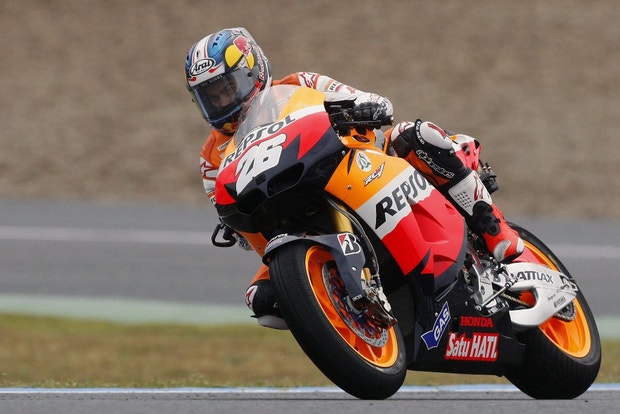 Quando seguia com o segundo melhor tempo (1.37.896 minutos), sensivelmente a meio da sessão, Pedrosa foi transportado pela assistência para as boxes, onde, sentado, continuou a segurar a boa marca, sem cair do topo da tabela.