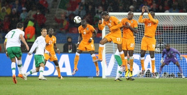 18' - Elano marca canto, Gilberto Silva remata de primeira, com a bola a ficar na defesa costa-marfinense, Robinho na recarga atira muito por cima da baliza de Barry.