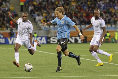 23' - Forlán tenta passar pelos adversários, embora acabe por chutar contra os defesas. O ponta-de-lança do Atlético de Madrid tem sido o único elemento desequilibrador no ataque uruguaio.
