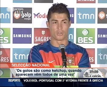 Quando faltam dois dias para a estreia da selecção nacional no Mundial da África do Sul, Ronaldo deixou um aviso: os golos são como ketchup e quando aparecem vêm todos de uma só vez.