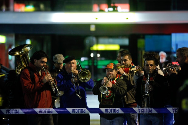 O repórter da Antena 1, João Miguel Nunes, no frio gelado da madrugada viu cachecóis e bandeiras ao alto e ouviu cânticos de "Portugal olé! Portugal olé!"