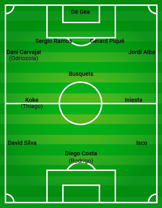 A frente de ataque está entregue a Diego Costa, uma das escolhas mais regulares de Lopetegui, e agora Hierro, que menos consenso recolhe nesta equipa espanhola. A substituir o avançado naturalizado está Rodrigo, jogador do Valencia, antigo Benfica.