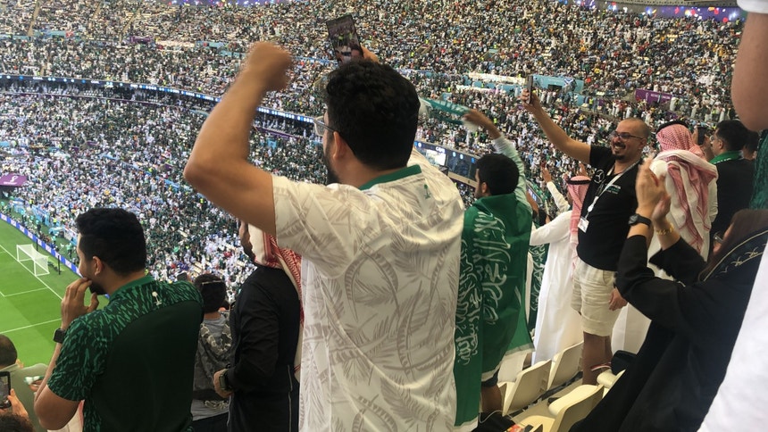 Já dentro do estádio e depois de ter ido buscar os bilhetes, mesmo para os jornalistas só a credencial não dá, sequer, para nos sentarmos e ver o jogo, subi para o meu lugar que ficava no sexto piso. Ao meu lado direito, estavam milhares e milhares de adeptos da Arábia Saudita. Estavam em minoria, é verdade, os argentinos que ocupavam o outro lado do estádio, ao meu lado esquerdo, estavam em maioria. Também aqui estavam a ganhar. Não por goleada, como no metro, mas ganhavam tranquilamente. Mais descansados devem ter ficado quando Messi abriu a contagem aos dez minutos. Ao meu lado, dois irmãos sauditas deliciavam-se com o astro argentino e festejavam os golos anulados aos sul americanos como se fossem deles. O melhor estava mesmo reservado para a segunda parte, ao primeiro golo festejaram, mas com alguma contenção, já ao segundo, pode-se dizer com propriedade que foi o fim do mundo porque um deles tinha um cachorro na mão e uma coca cola na outra, escusado será dizer que a minha camisa foi diretamente para o saco da roupa suja. A partir daí foi sempre a abrir. Não foi bar aberto porque por estas bandas isso não é bem visto. A mancha verde tomou conta do estádio, das imediações, do centro da cidade e, obviamente, do metro. No regresso, os argentinos vinham tristes e calados, já os sauditas…ui que festa! Foi um verdadeiro David contra Golias. Ainda bem que o futebol ainda é um desporto e que nem sempre ganham os mais fortes.