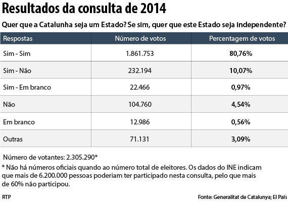 Menos de 60 por cento dos potenciais votantes participam nesta consulta à população. Entre os participantes, os defensores da independência catalã apresentam-se em grande maioria: mais de 80 por cento responde afirmativamente às duas questões. Depois da consulta simbólica, Barcelona mantém o objetivo: um referendo a sério que abra as portas à independência.