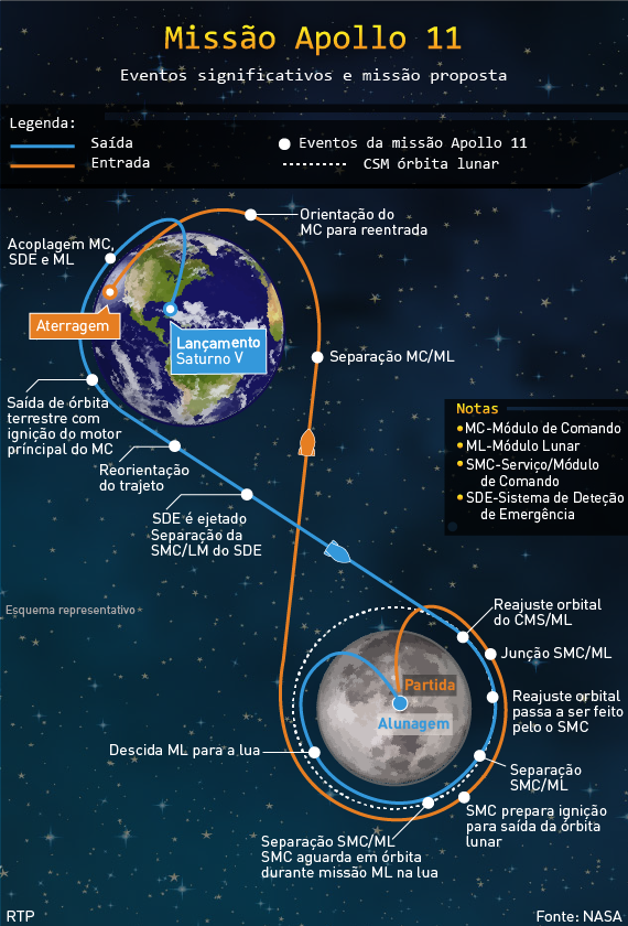 Sob o olhar de centenas de milhares de pessoas que enchiam as estradas e os arredores do Centro Espacial Kennedy e de milhões de espectadores que pela televisão seguiam a cena por todo o mundo, o foguetão Saturno V subia agora para a histórica missão de oito dias, que colocaria finalmente e pela primeira vez na história da Humanidade dois homens na Lua: Armstrong e Aldrin.