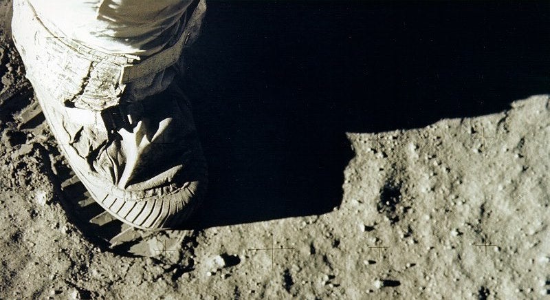 O fino e cinzento pó lunar, agora compactado pelo peso de Armstrong, ficaria registado na foto tirada pelo próprio, logo após as palavras que imortalizaram o homem e o momento: “Um pequeno passo para um homem, um salto gigantesco para a Humanidade (That's one small step for man, one giant leep for mankind)".