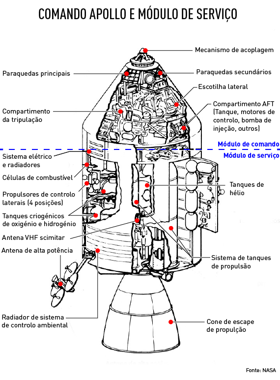 O Módulo de Comando é composto exclusivamente pela cápsula, com formato cónico, onde os astronautas iam instalados durante a maior parte da viagem.