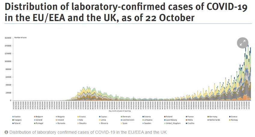 Através de um outro gráfico, o EDCD fornece uma leitura muito clara sobre a evolução da pandemia na Europa ao longo do tempo. Com o gráfico seguinte, temos uma visualização do que tanto se tem falado nos últimos dias. A primeira onde de Covid, que passou, e a segunda que está em curso. Mais pronunciada e ainda sem qualquer sinal de que o pico, ou seja, o pior, já tenha passado. O gráfico mostra a distribuição de casos confirmados em laboratório na Europa até ao dia 22 de outubro.