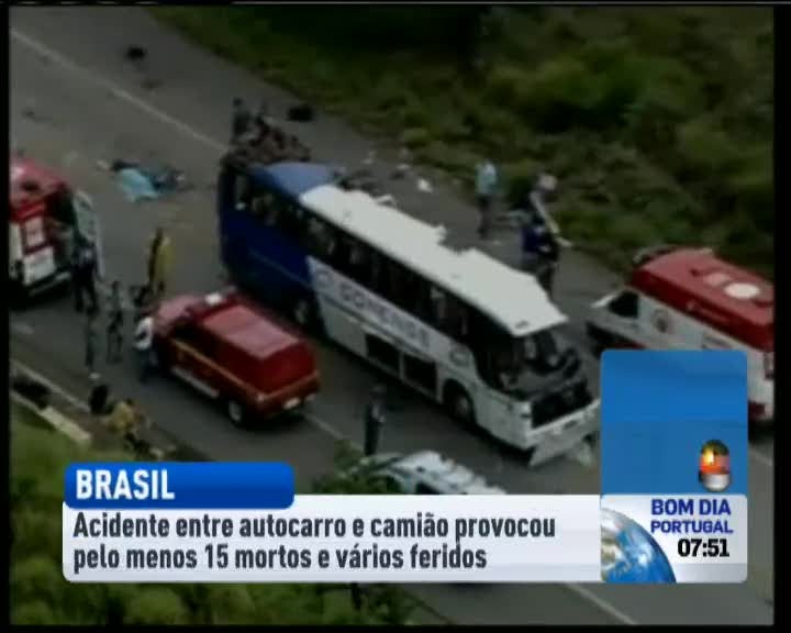 Um acidente com um autocarro e um camião no Brasil provocou a morte de 15 pessoas. Há ainda 29 feridos, alguns em estado grave. Muitas das vítimas ficaram encarceradas dentro do autocarro. Na origem do acidente terá estado uma ultrapassagem mal calculada.