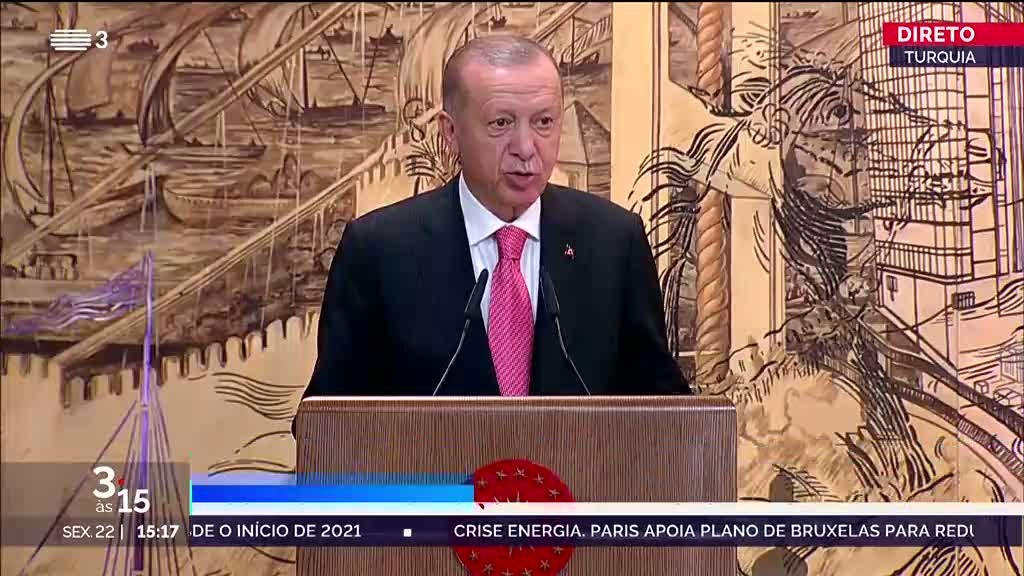 O presidente turco discursou na cerimónia de assinatura do acordo sobre cereais, dizendo que "esta atmosfera de paz e amizade que conseguimos restabelecer vai trazer benefícios a toda a humanidade".