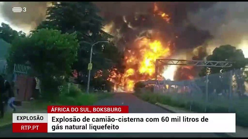 A explosão de um camião-cisterna na cidade de Boksburg fez 15 mortos e cerca de 40 feridos. Nas imagens temos o registo de uma segunda explosão. Entre os feridos estão seis bombeiros que tentavam nesta altura apagar o incêndio. O camião-cisterna ficou preso quando passava por baixo de uma ponte. O veículo, que transportava 60 mil litros de gás natural liquefeito, ultrapassava a altura permitida.