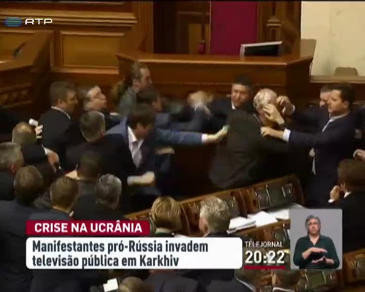 Agrava-se a crise no país com várias manifestações pró-Rússia. A NATO avisa Moscovo que poderá enfrentar medidas punitivas mais graves, caso incentive os movimentos de desagregação da Ucrânia. Desta vez, os manifestantes invadiram as instalações da televisão pública e alguns deputados ucranianos agrediram-se no parlamento.