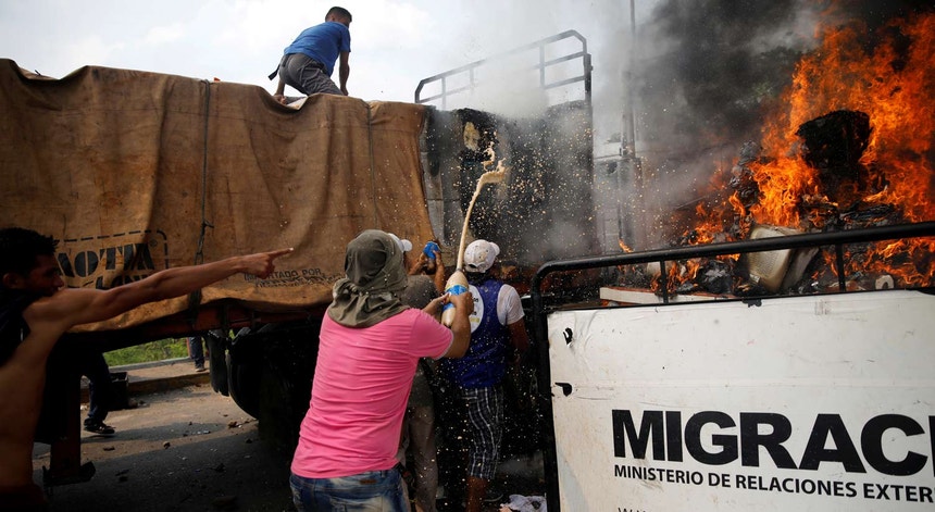 "Após a chegada dos camiões, as forças de segurança venezuelanas lançaram gás lacrimogéneo [contra os manifestantes]. Alguns manifestantes responderam com pedras e `coquetéis Molotov`. Um deles lançou um coquetel contra as forças de segurança e, segundos depois, um dos camiões estava em chamas", avança o diário.
