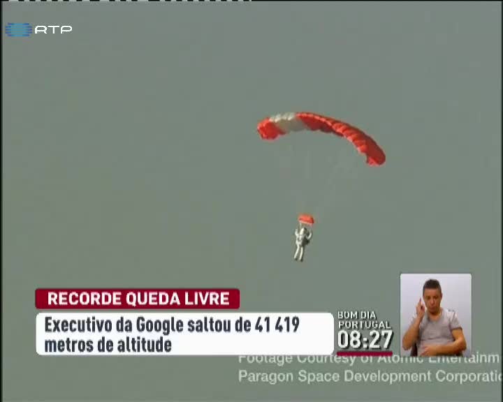Há um novo recorde de salto em queda livre, Alan Eustace, um executivo da Google, saltou de uma altitude de 41. 419 metros, em apenas quatro minutos e meio. O voo estratosférico foi realizado, esta sexta-feira, no Novo México. Depois de três anos de planeamento, o balão demorou cerca de duas horas a atingir a altitude de quase 41 quilómetros e meio. O anterior recorde de salto de paraquedas, a partir de um balão, tinha sido registado em 2012, por Felix Baumgartner.