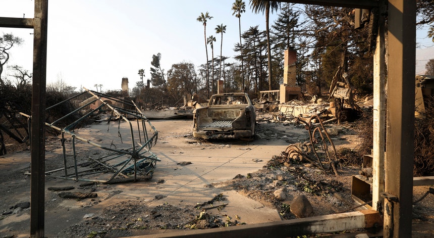 Em Altadena, há casas intactas e outras completamente destruídas pelo fogo. Milhares de pessoas ficaram desalojadas, mas os moradores não estão autorizados a regressarem devido à falta de água potável, energia e ao ar tóxico.