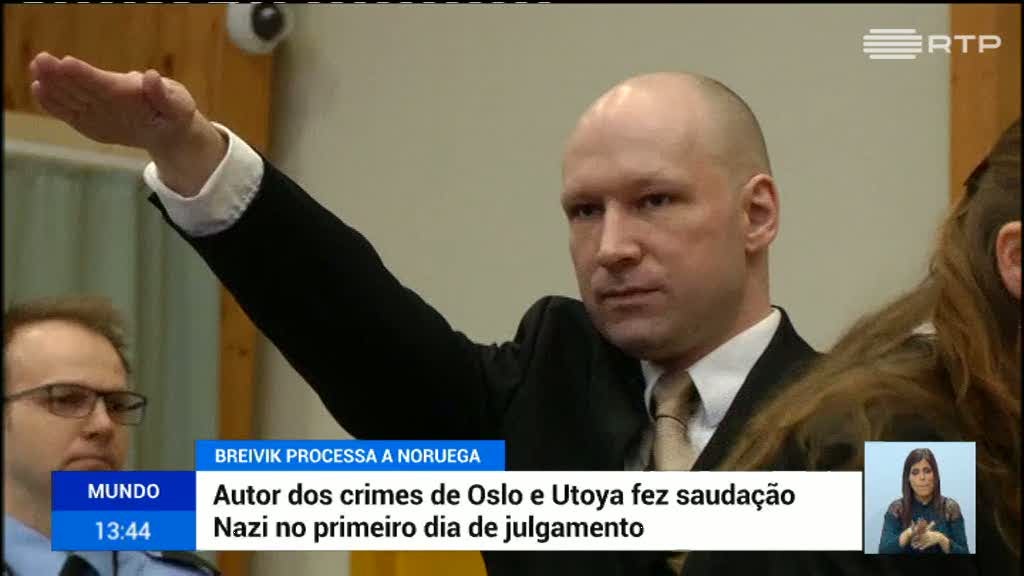 À chegada à primeira sessão de julgamento, Breivik levantou o braço numa saudação nazi.