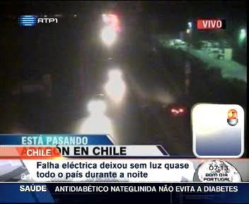 Grande parte do Chile ficou sem luz esta noite. O apagão foi provocado por uma falha num transformador do sistema central de distribuição eléctrica. Durante várias horas o país viveu às escuras. Agora a luz já foi restabelecida a 80 por cento.