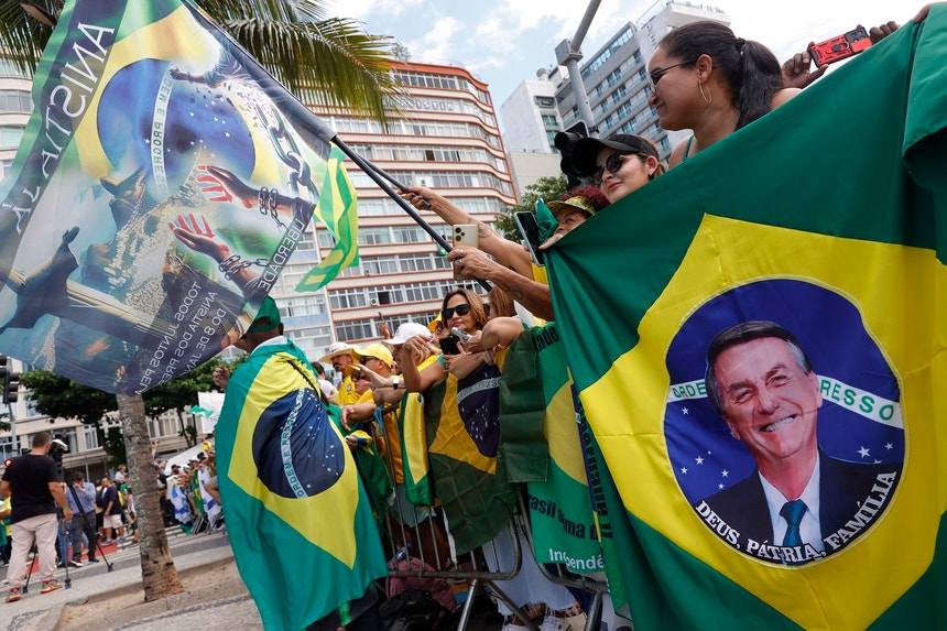 Apoiantes do ex-presidente do Brasil Jair Bolsonaro manifestam-se a esta hora em Copacabana, no Rio de Janeiro.