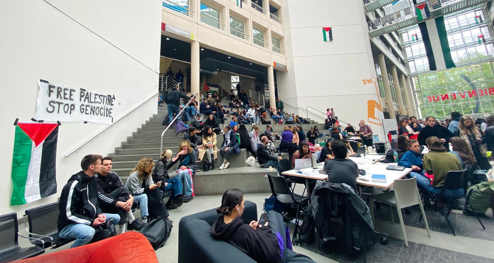 Face à ameaça de desmobilização, no domingo à noite centenas de pessoas reuniram-se frente à universidade para protestar “contra a repressão” e “em solidariedade com a Palestina” mas também para apelar à demissão da reitoria. Uma mobilização que se repetiu em força no dia seguinte, na sequência dos desenvolvimentos.
