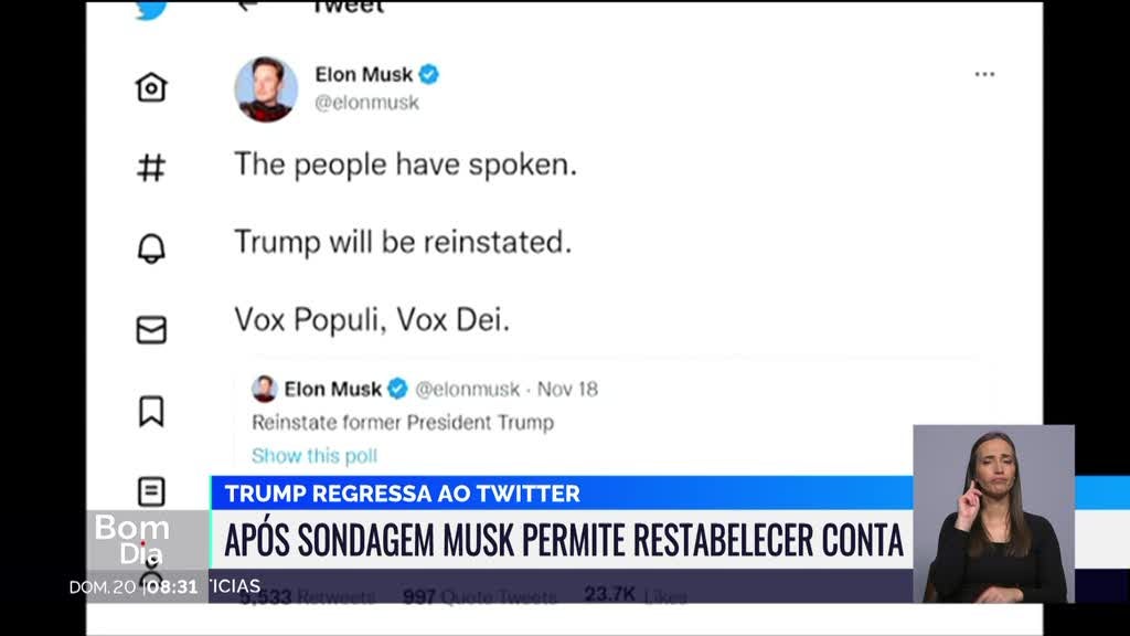 Donald Trump pode regressar ao Twitter. A conta foi reativada por ordem de Elon Musk. O novo dono da rede social fez uma sondagem pública de 24 horas para perguntar se o antigo presidente norte-americano deveria voltar a ter esta conta.