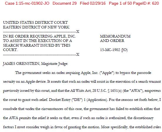 A “All Writs Act”, de 1789, é a lei invocada pelo Governo para exigir da Apple colaboração no desbloqueio de iPhones de vários suspeitos. No entanto, o juiz refere que o Governo está a extrapolar a sua autoridade nesta situação para extrair dados do iPhone apreendido com ligações a um caso de drogas.