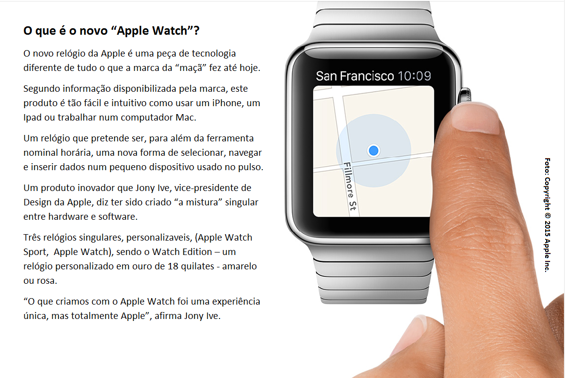 O novo “Apple Watch”está disponível em três coleções, Apple Watch Sport, Apple Watch e Apple Watch Edição – um relógio personalizado em tons rosa ou amarelo com uma moldura feita em liga de ouro de 18 quilates.