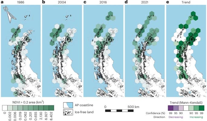 A península, com cerca de 500 mil quilómetros quadrados, no total, continua dominada por gelo e rocha nua. Contudo, o crescimento de cobertura vegetal é um sinal do alcance do aquecimento global na Antártica, local que tem registado temperaturas que coloca a região no topo do ranking das que mais aquecem, relativamente média do planeta.
