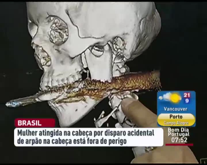 No Brasil, uma mulher foi atingida na cabeça por um arpão para caça submarina. O marido estava a limpar arma quando ocorreu o disparo. Atingiu-a no maxilar. A mulher de 28 anos está bem e já consegue dizer algumas palavras.