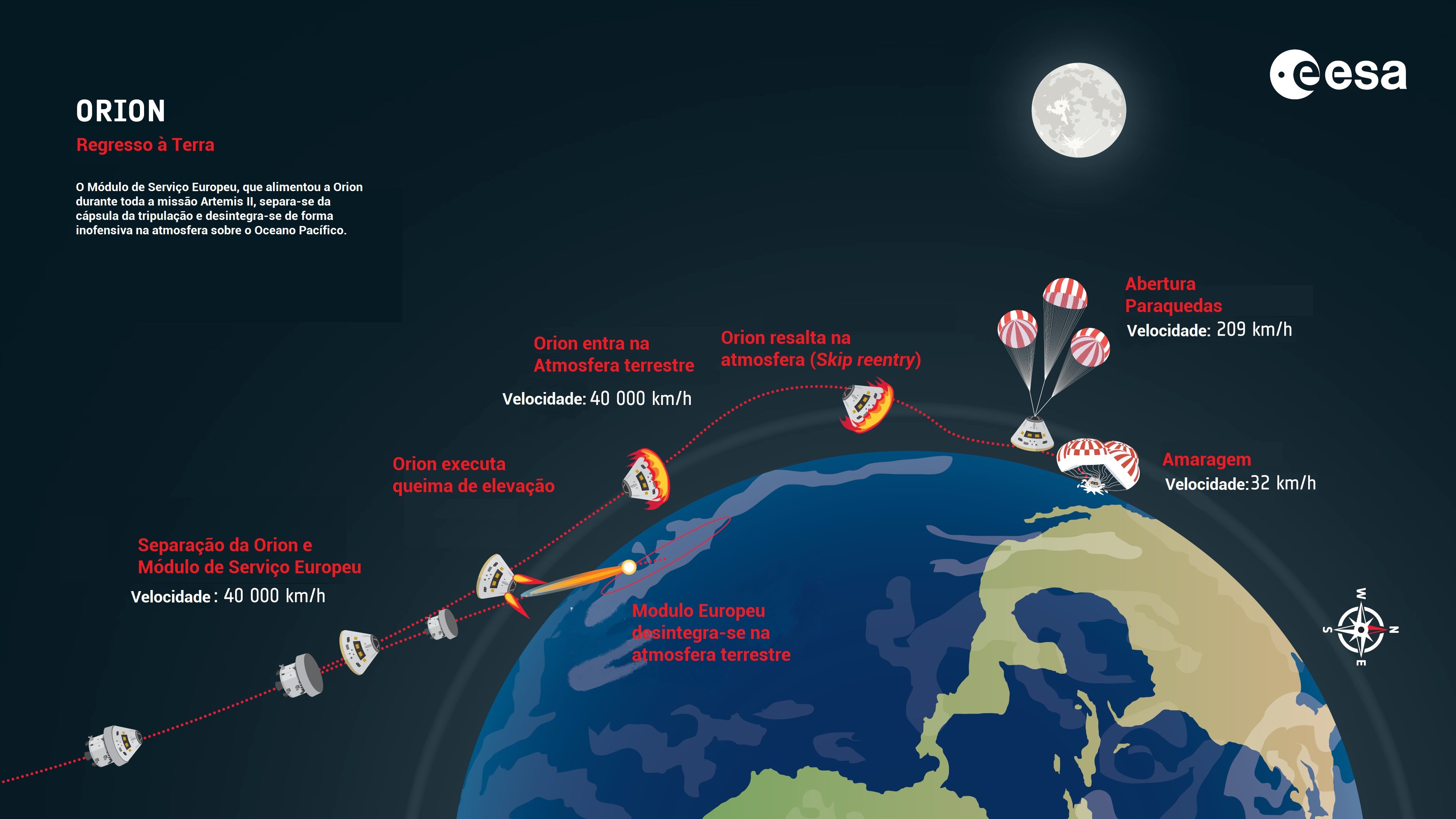 Depois da viagem de regresso à Terra, a reentrada e amaragem segura no azul marinho do Pacífico. Uma reentrada da Orion que começa ainda no espaço. Nos cerca de nove dias da missão Artemis II, em que viajaram até à Lua a bordo da nave espacial Integrity, os quatro astronautas sabiam que uma das partes fulcrais da missão passava obrigatoriamente pelo regresso sãos e salvos. Para isso tiveram que posicionar cuidadosamente o veículo espacial na rota certa para o planeta azul.