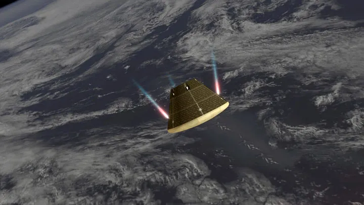 À medida que a velocidade diminui, o plasma desaparece e as comunicações regressam e as temperaturas descem abruptamente. A Orion neste ponto viaja já a velocidades subsónicas quando inicia a sequência final.