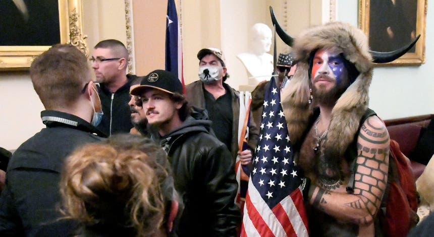 Jacob Anthony Chansley, o homem visto a invadir o Capitólio com um chapéu de pêlo, um adereço com cornos e a bandeira americana pintada no rosto e erguida na mão, foi acusado de entrada violenta e conduta desordeira.