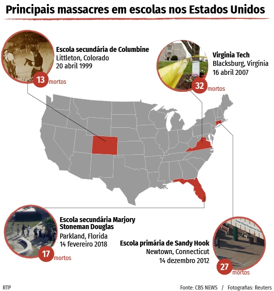 O massacre na secundária Marjory Stoneman Douglas é já o 18.º incidente a envolver armas de fogo em escolas ou locais próximos de estabelecimentos de ensino nos Estados Unidos este ano de 2018. Os números são da Everytown for Gun Safety. Desde 2013, houve quase 300 ataques com armas de fogo em escolas do país, numa média de um ataque por semana.