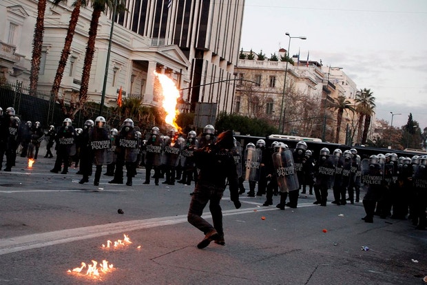 A Praça Sintagma, na capital da Grécia, foi fechada pela polícia esta madrugada, de forma a garantir que os deputados gregos pudessem votar normalmente o memorando de entendimento com a ‘troika’ que implica um novo pacote de austeridade, condição para Atenas receber o segundo resgate, o qual evita a bancarrota. Do lado de fora, o cenário era de destruição e caos. Lojas, paragens de autocarro, bancos, autarquia, semáforos, quiosques, nada escapou à fúria destruidora dos manifestantes que contestavam a aprovação do novo pacote de austeridade.