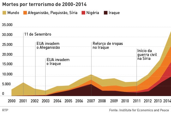 O índice do terrorismo mundial mostra que 32.658 pessoas perderam a vida na sequência de atentados, em 2014. Tinham sido 18.111 no ano anterior. A escalada dos números acontece a um ritmo inédito.