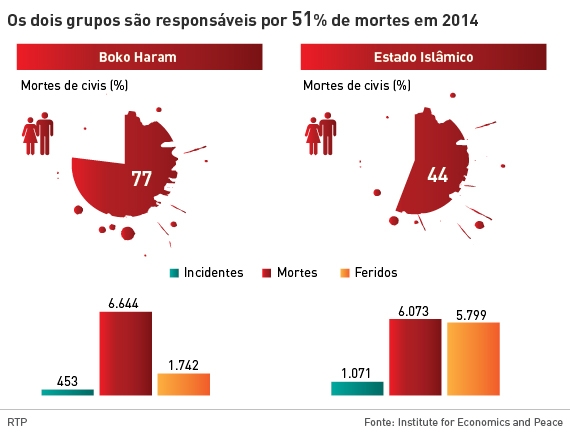As duas organizações terroristas são responsáveis por mais de metade do número de vítimas mortais em 2014. O Boko Haram, organização baseada na Nigéria, é o mais mortífero, tendo provocado a morte a 6.644 pessoas. O Boko Haram duplicou os ataques desde 2013 e quadruplicou o número de mortos, ultrapassando o Estado Islâmico em termos de vítimas mortais.