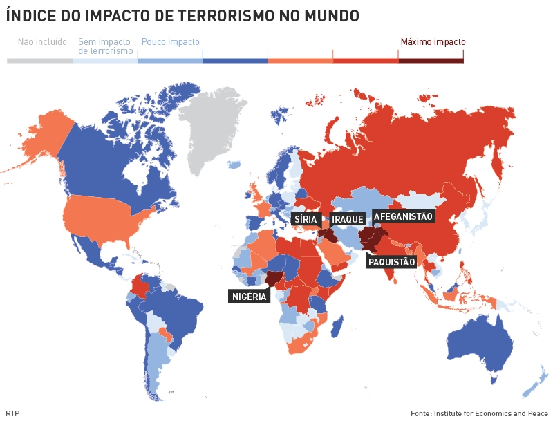 Em 2014, a Nigéria os atentados fizeram triplicar o número de mortos. O Iraque é aquele em que o terrorismo tem mais impacto: 9.929 mortos, o maior número de vítimas alguma vez registado num só país.