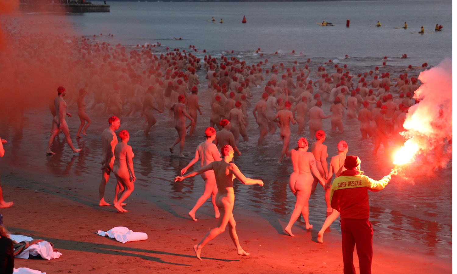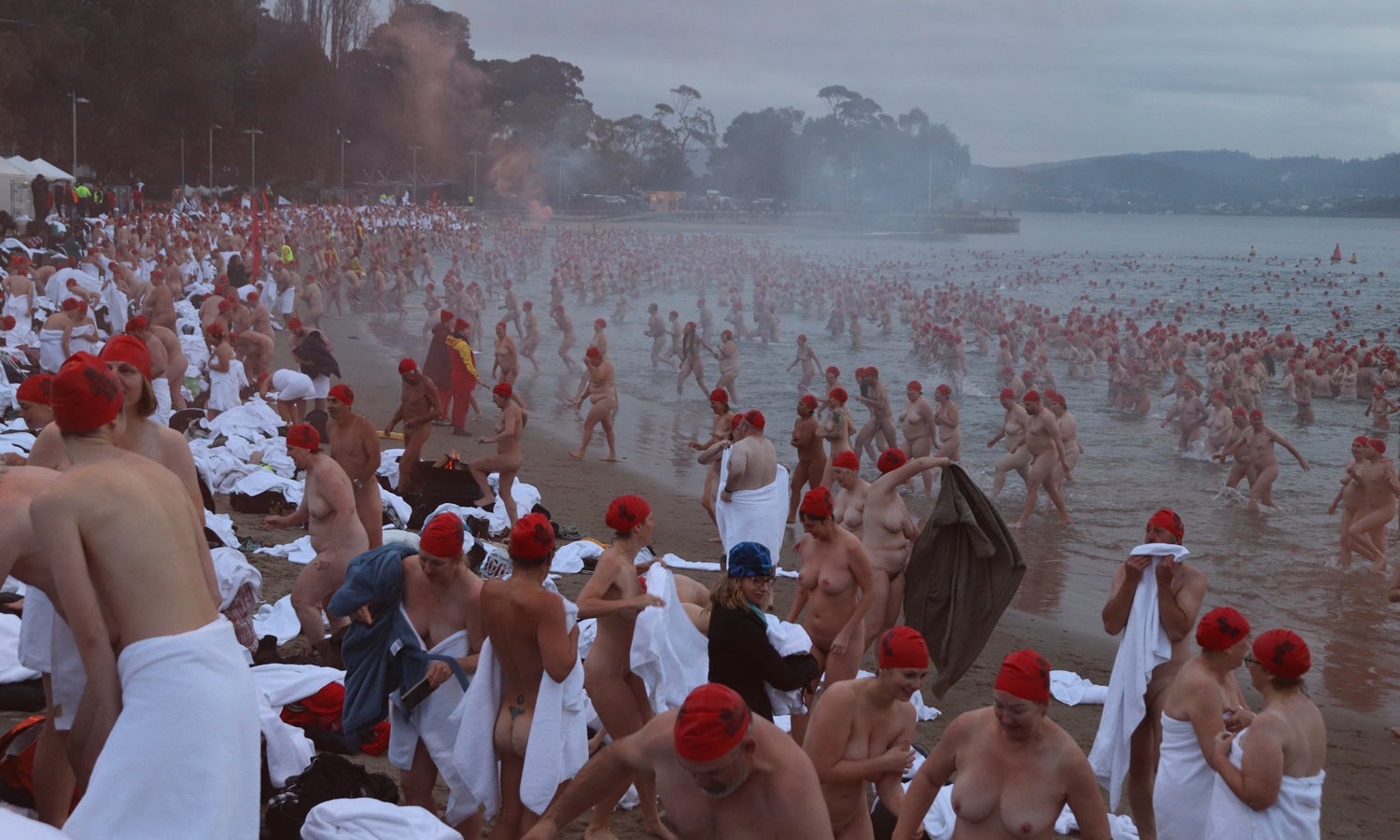Nesse momento, três mil pessoas, todas nuas, correram para a água na costa de Long Beach, em Hobart.